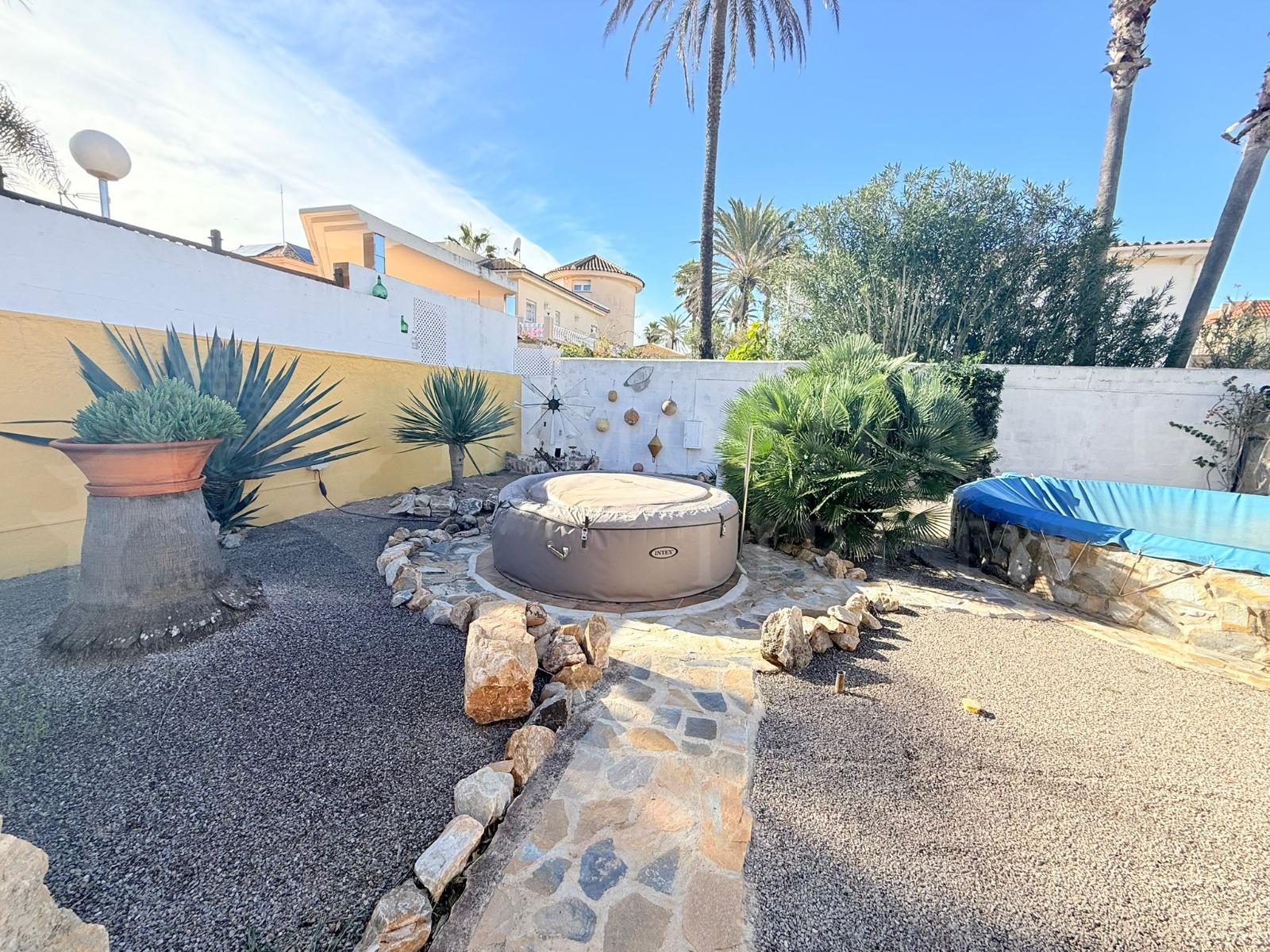 El exterior es igualmente impresionante, ya que cuenta con un jardín bien cuidado, una barbacoa y una zona de descanso techada, así como con una piscina privada y un jacuzzi. Además, cuenta con dos trasteros y un amplio garaje.